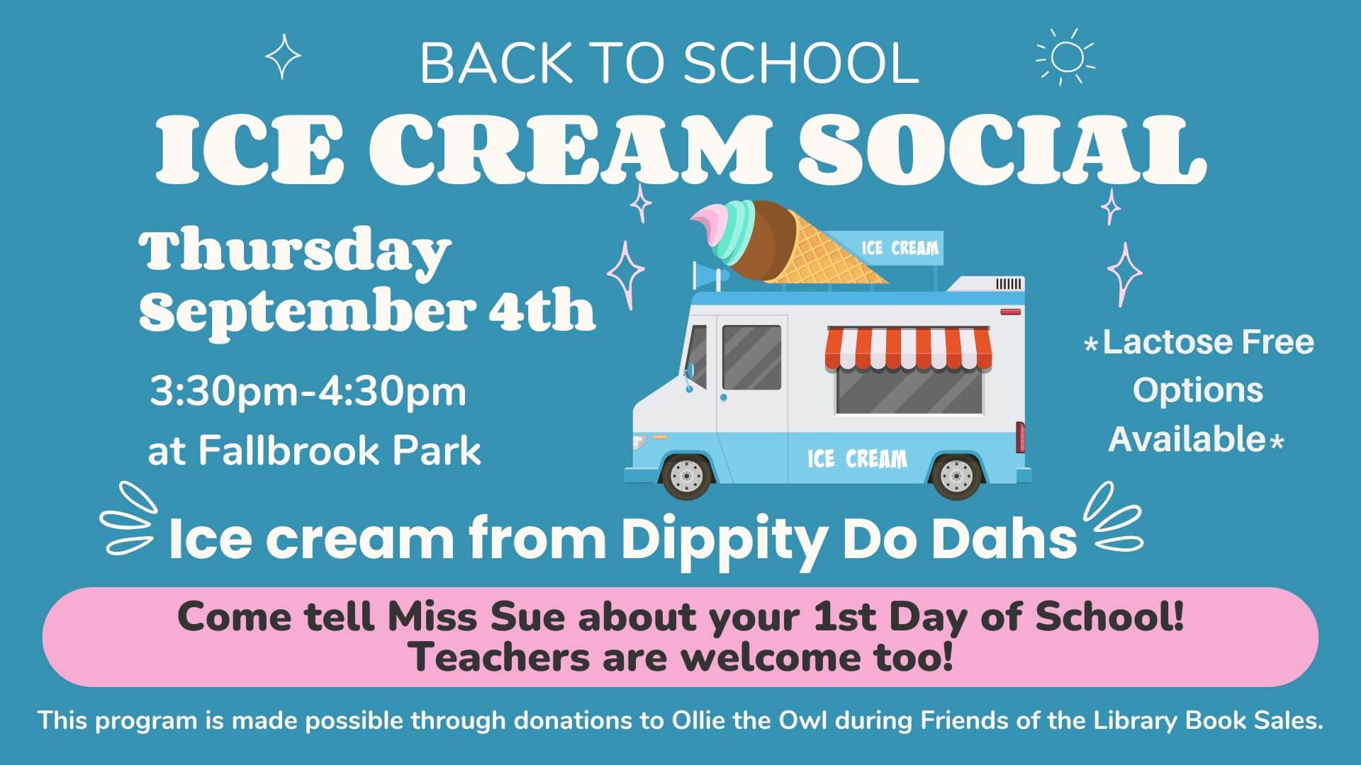 You are invited to join Miss Sue in Fallbrook Park for the annual Back to School Ice Cream Social.