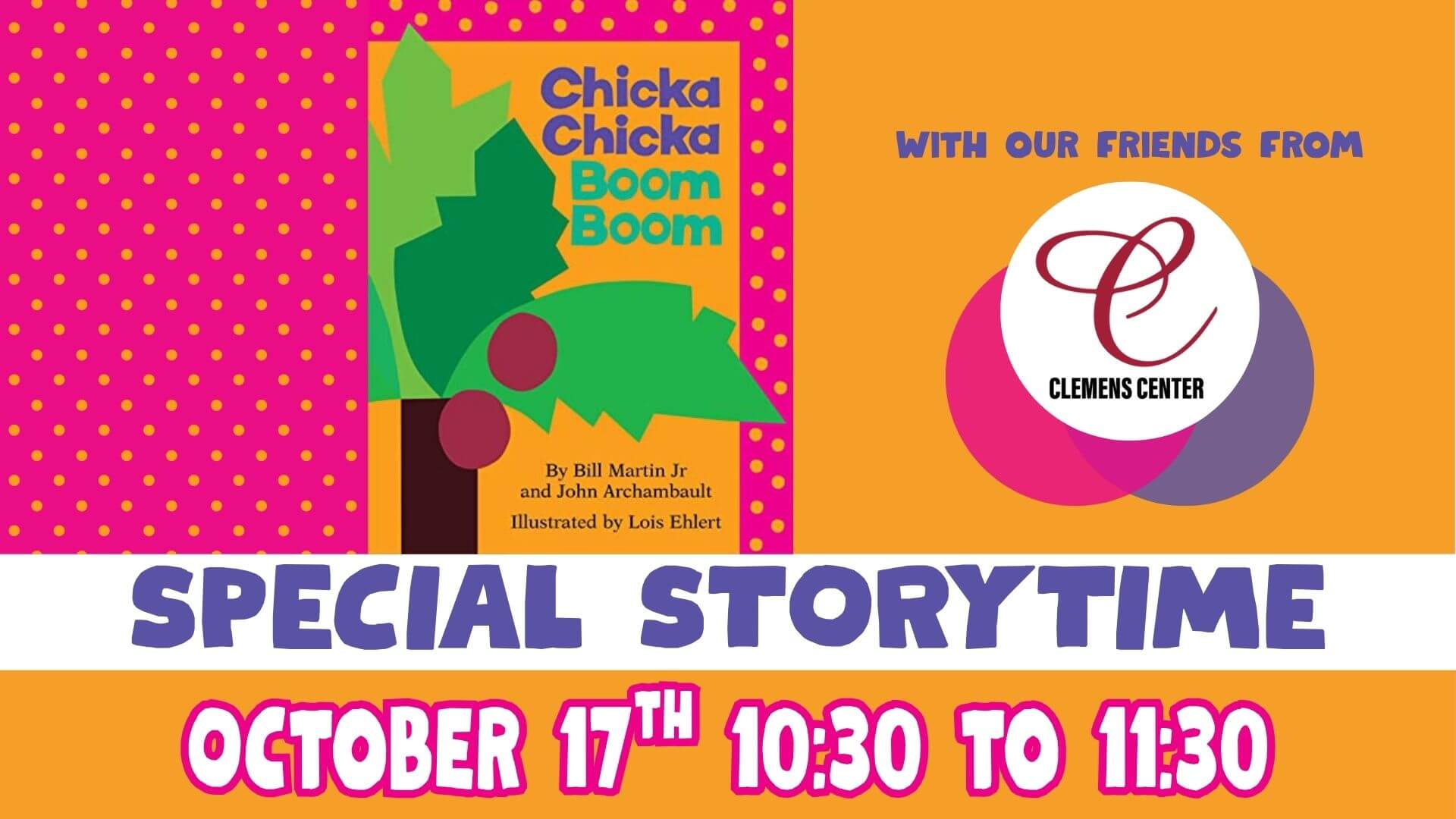The Clemens Center will host a production of Chicka Chicka Boom Boom: The Musical on October 25 at 2:00 PM, and someone from the Clemens Center will be at the storytime with information about the musical.