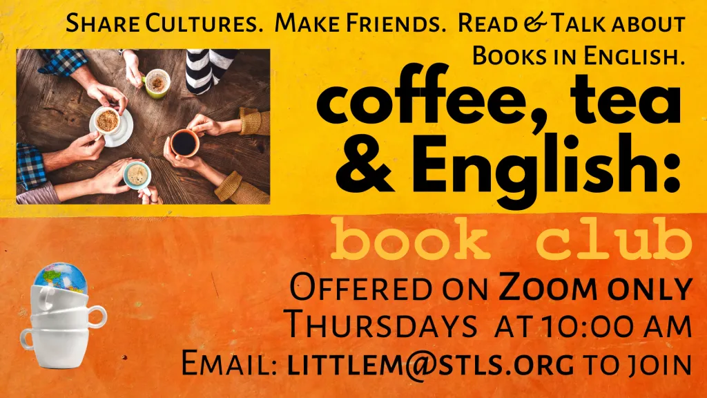 The Coffee, Tea & English Book Club is intended for international people. The book is chosen by the facilitator with the group’s needs and language skills in mind. Participants read on their own and then meet weekly to discuss the material as prompted by prepared questions. This serves as another opportunity to practice English language skills in a relaxed environment.