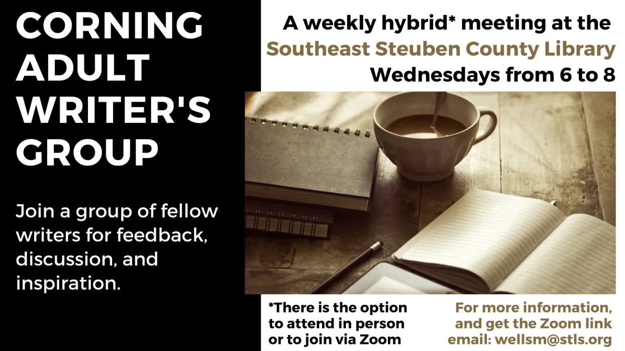 Writing can be a lonely pursuit, but it doesn’t have to be. Join a group of fellow writers for conversation, inspiration and feedback. The Corning Adult Writer’s Group has been encouraging and supporting fellow writers for over 12 years.