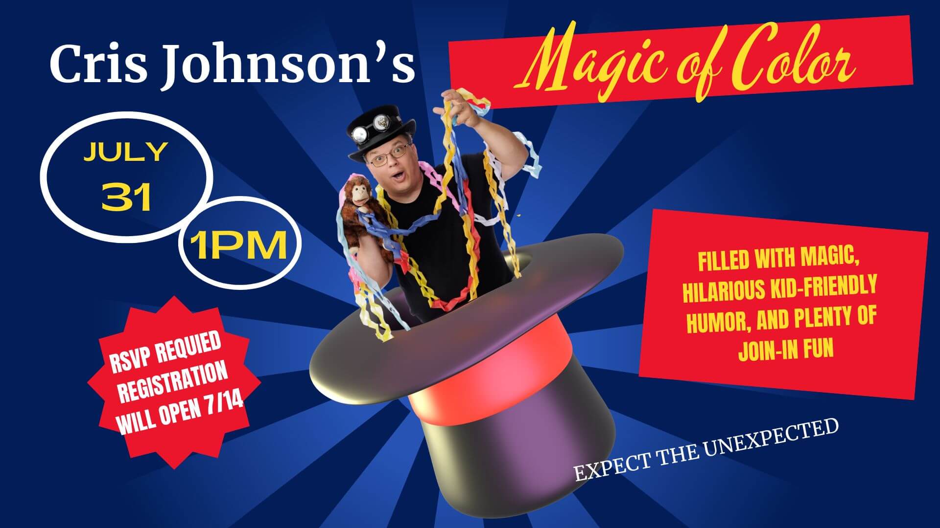 Cris Johnson’s Magic of Color is a fun color-themed magic show, filled with amazing magic, hilarious kid-friendly humor, and plenty of join-in fun.