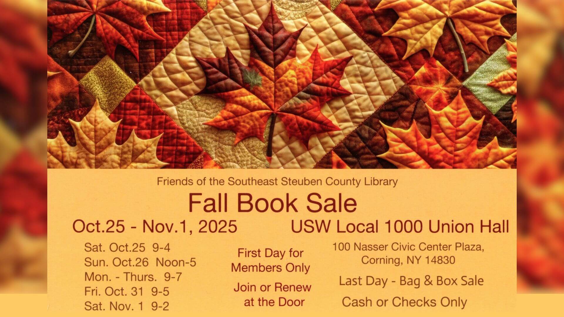 The Friends of the Library Fall 2025 Book Sale takes place from October 25 – November 1, 2025, at the United Steel Workers Local 1000 Union Hall, 100 Nasser Civic Center Plaza, next door to the Library.