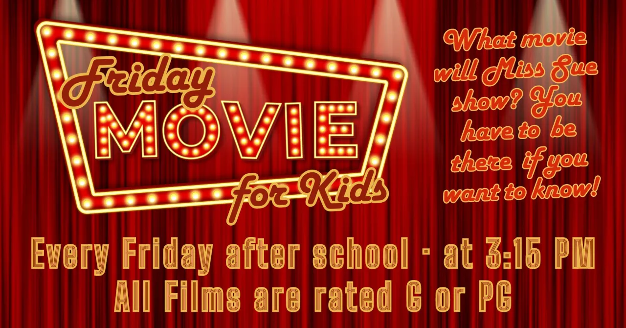 Every Friday afternoon Miss Sue will show a new movie for kids. All the films will start at 3:15 PM and will be rated G or PG.