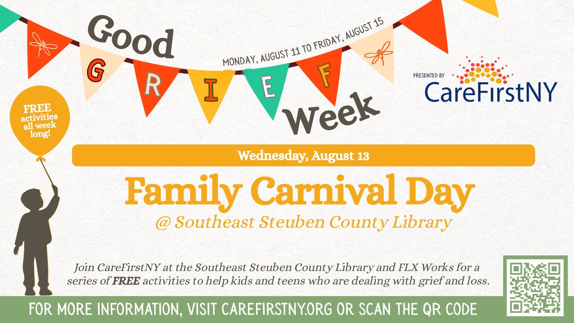 To close out our Good Grief Week activities in at the Southeast Steuben County Library, we invite you to Family Carnival Day: a time to gather with family to play games, earn treats, and have some fun!