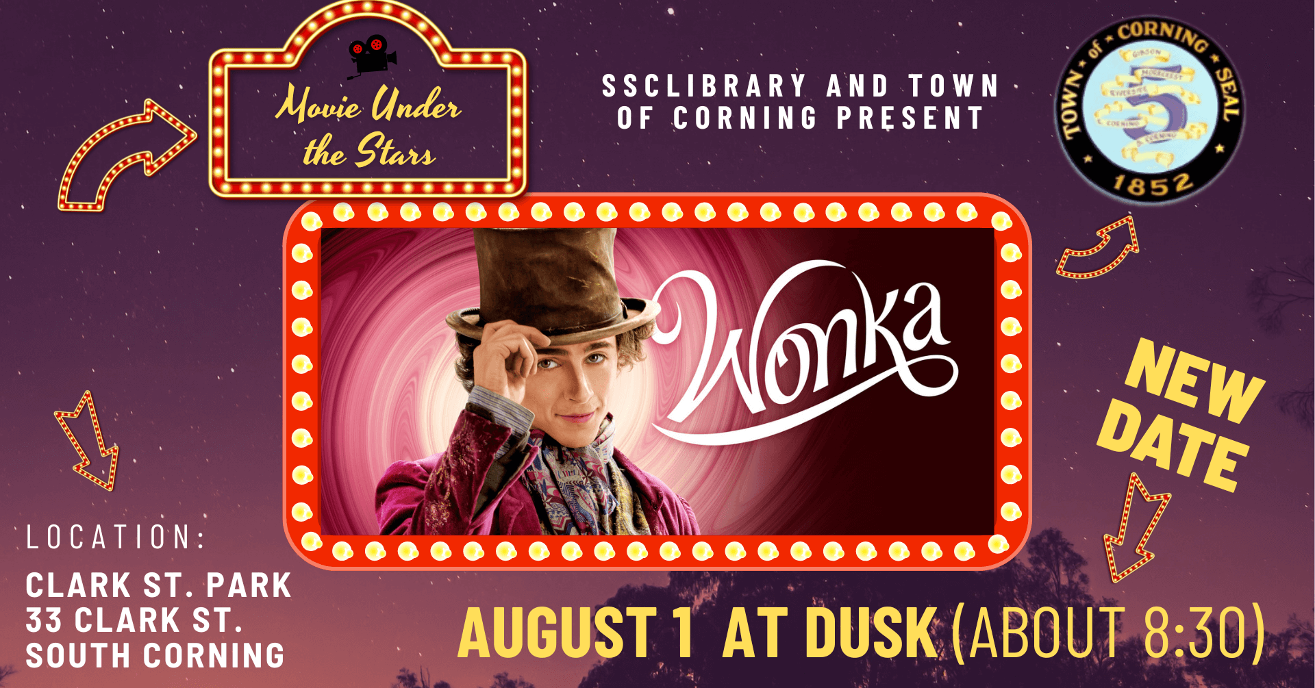 We will meet in Clark Street Park in South Corning at dusk (about 8:30 PM) to watch Wonka, directed by Paul King and starring Timotheé Chalamet.