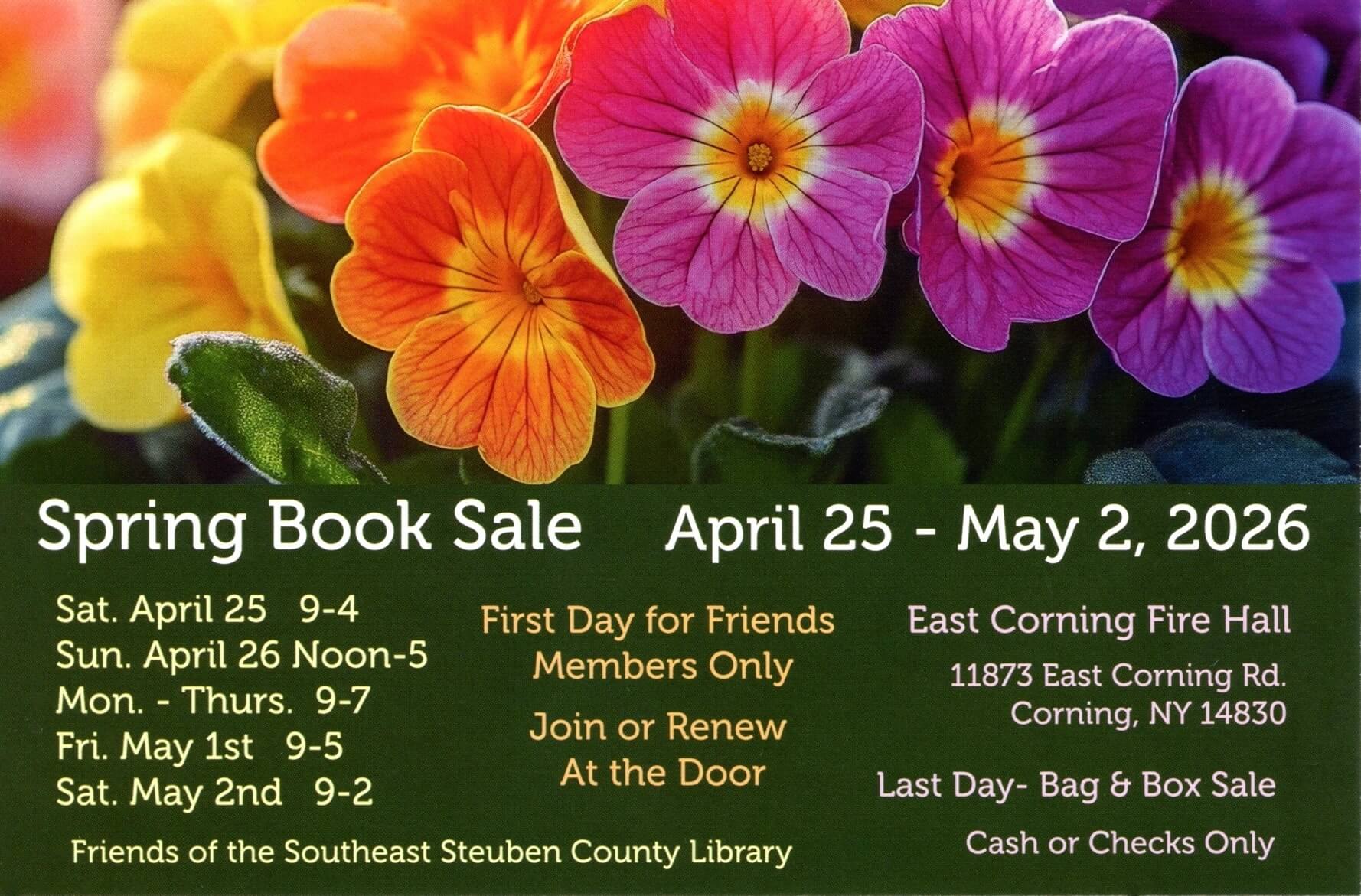 The Friends of the Library Spring 2026 Book Sale takes place from April 25 – May 2, 2026, at the East Corning Fire Hall, 11873 East Corning Road, Corning, New York. Find your favorite books, music, movies, puzzles, games and more among the 30,000+ items being offered. All proceeds benefit the Southeast Steuben County Library.