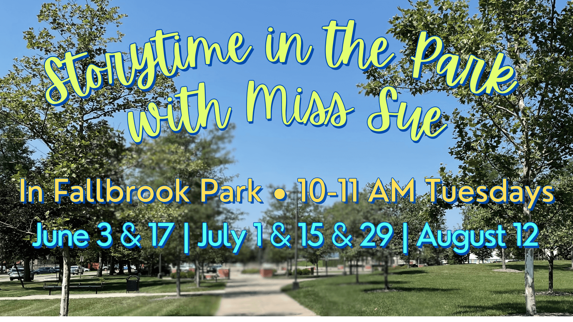 Join Miss Sue in Fallbrook Park for a story, and stay after storytime to play with our friends from the Nonie Hood Parent Resource center.