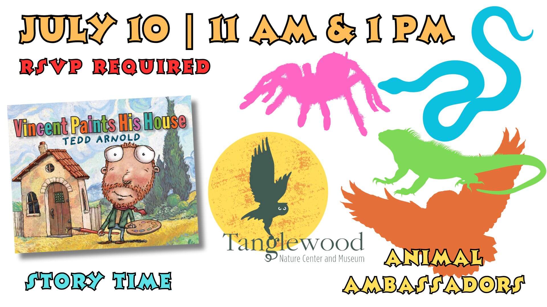 Staff will read the book, Vincent Paints His House by Todd Arnold, and four animal ambassadors will join everyone for the visit.