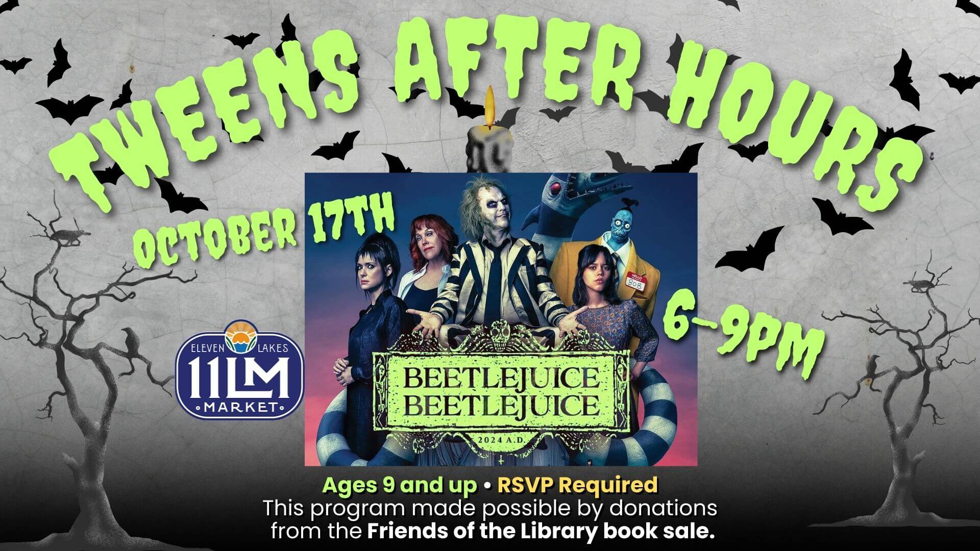 Join us and Eleven Lakes Market to create a Beetlejuice themed art project, and then stay for a viewing of Beetlejuice Beetlejuice.