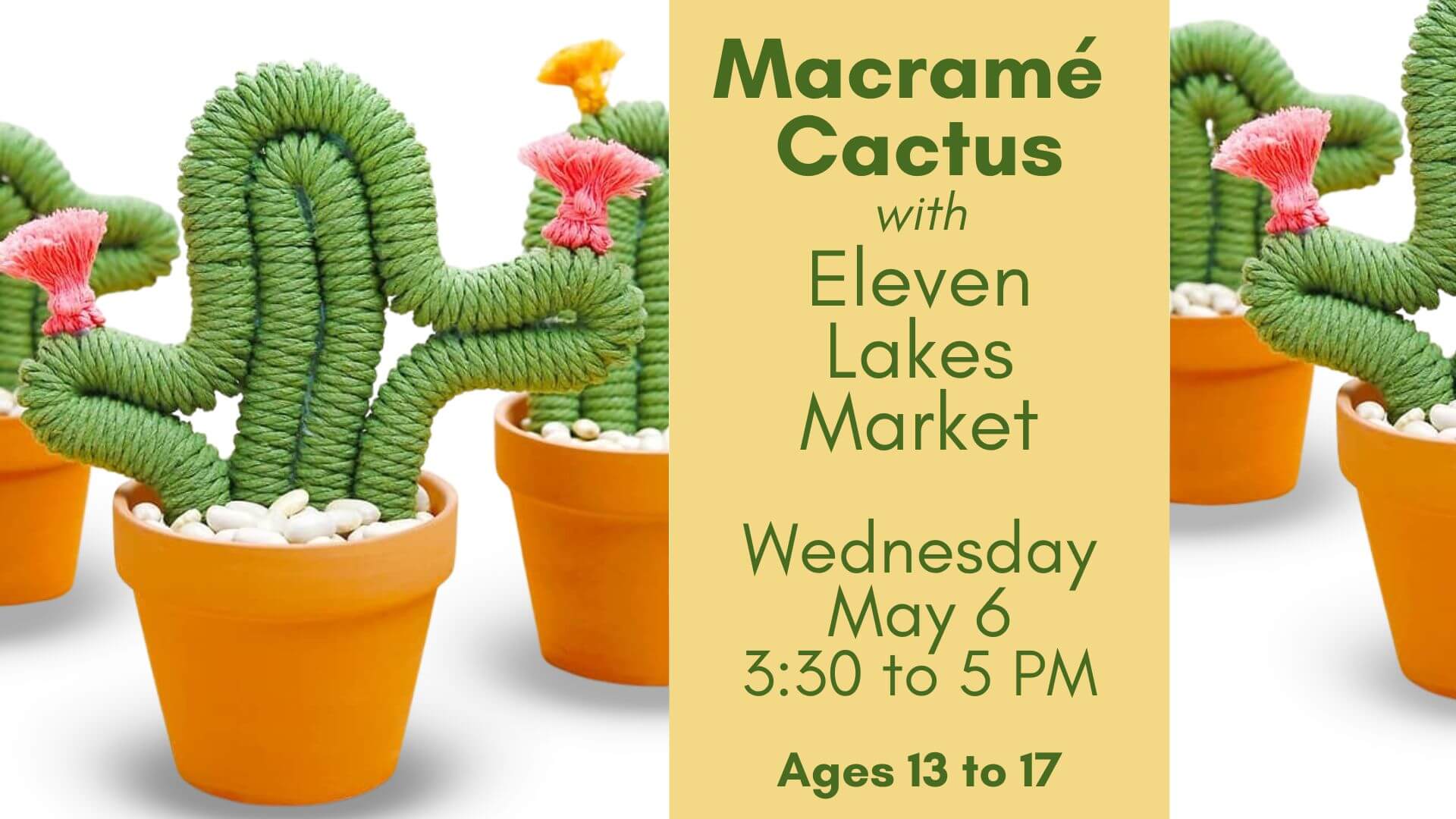 Join us and our guest artist, Eleven Lakes Market, to make your own Macramé Cactus. Learn a basic macrame technique to create a cactus that never needs watering.