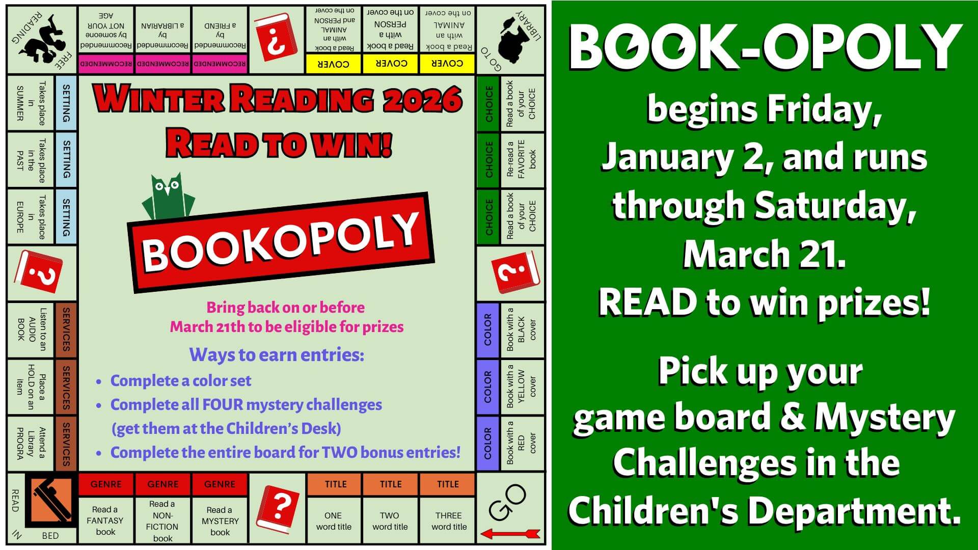 Bookopoly begins on Friday, January 2, and runs through Saturday, March 21. Read to win prizes!
