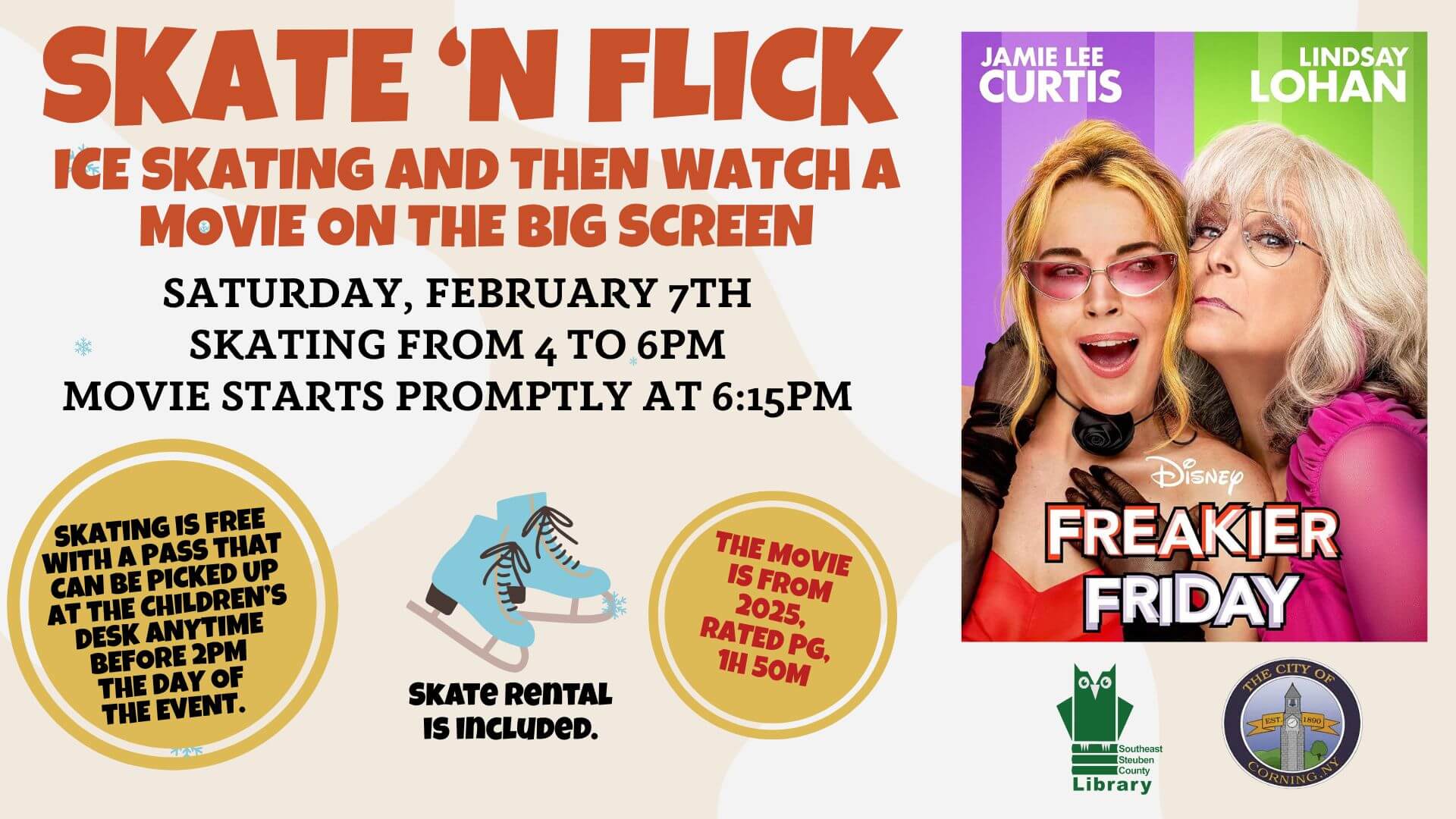 | 0 events, | 0 events, | 2 events,![]() On Thursdays, between 10AM and 3PM, homeschoolers can skate at the Nasser Civic Center Ice Rink for a reduced rate of $3, with a skate rental of only $1 (if you don't have your own skates). There will be no homeschool ice skating discounts on December 25th or January 1st. - ![]() Celebrate friendship with Miss Sue from the Southeast Steuben County Library! | 1 event,![]() Every Friday afternoon through June 7, Miss Sue will show a new movie for kids. All the films will start at 3:15 PM and will be rated G or PG. | 1 event, - ![]() Enjoy ice skating at the civic center ice rink and then watch a movie on the big screen at the Library. | 0 events, | |